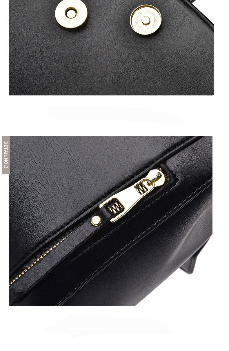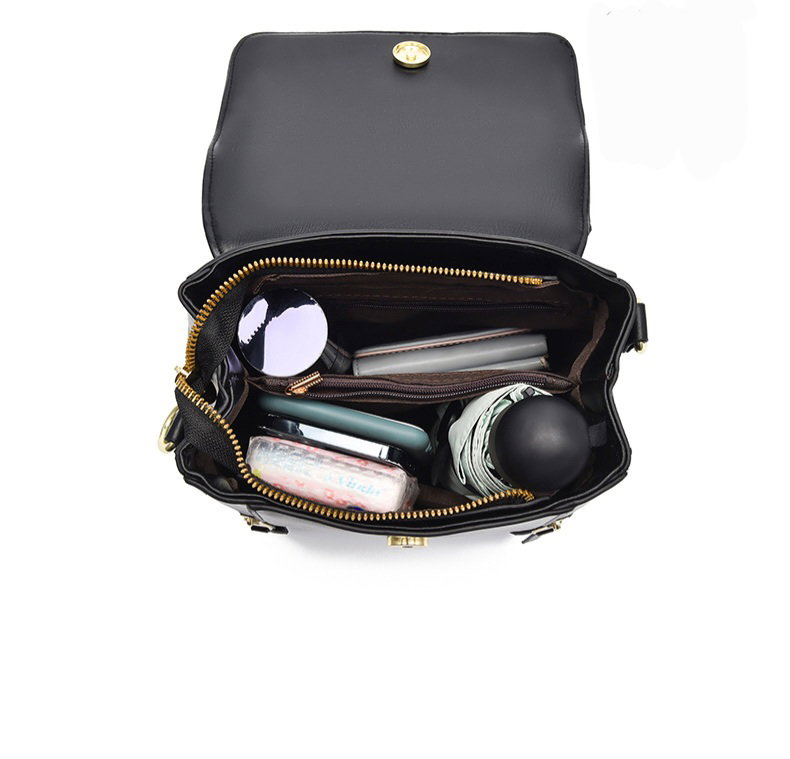 Posee un bolsillo interno con cierre, un bolsillo divisor interno con cierre y un bolsillo en su parte posterior con cierre